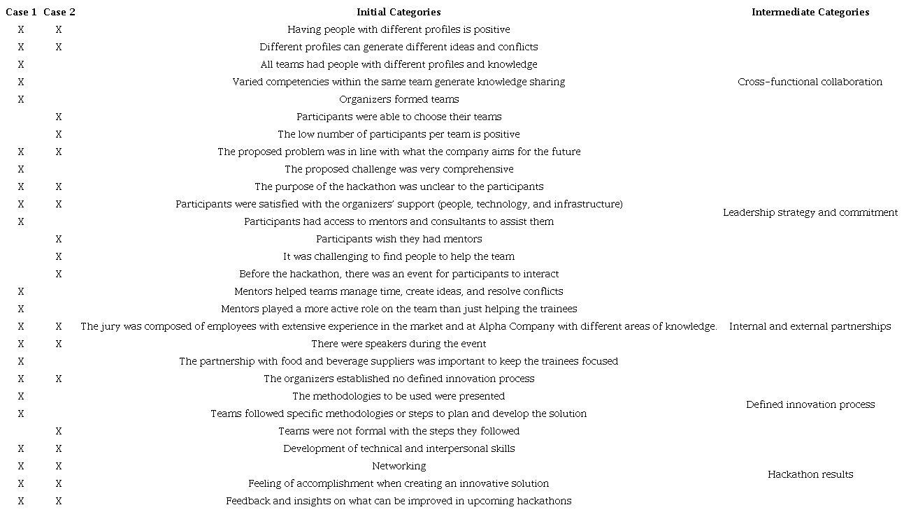 The case selection for empirical research utilized two criteria: a) hackathons that took place less than two years ago, ensuring that those involved remained clear about the development of the event and its enabling elements; b) hackathons that have involved employees of the promoting company and that have had facilitators to conduct the process, thereby guaranteeing the presence of a planning process for the events.