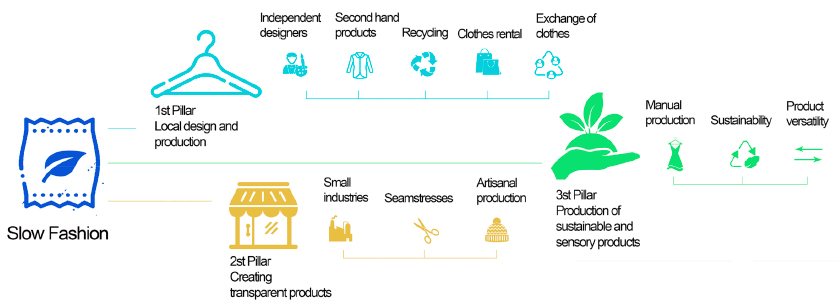 The three pillars of slow fashion were presented at the “Slow Design” symposium. The first pillar emphasizes local design and production and its objective is to promote the encouragement of diversified and innovative business models, under the ecological, social and cultural dimensions. The second addresses the creation of transparent products, that is, it seeks to promote the creation of bonds through the recognition of the needs for what is being created. The third is based on the production of sustainable and sensorial objects, which are seen as an investment and not something disposable. The pieces are part of an experience in the life of those who consume and their useful life is more valued (Clark, 2008; Ertekin & Atik, 2015).