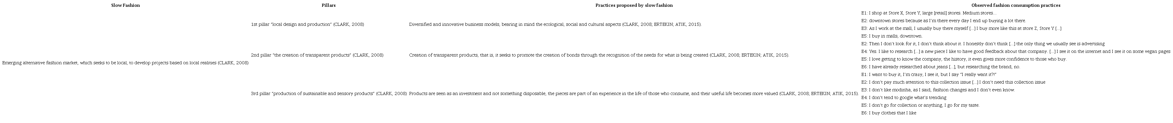 For the analysis, a table was prepared considering the concept of slow fashion presented in the first column. In the next column there is the proposal of each of the pillars that support it, followed by practices proposed by slow. It is possible to verify the types of practices proposed within each pillar in Table 2 and, in the last column of the table, the consumption practices observed in the interviews are indicated.