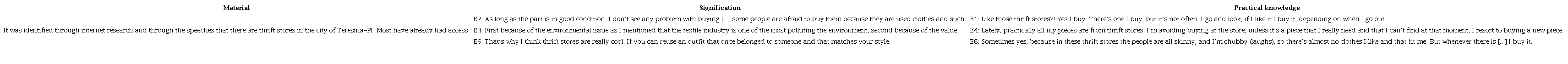 In the practices observed in the 1st pillar, consumption is concentrated in large national retail chains. When considering this consumption, paying attention to the TPs, the following can be identified as material: shopping malls and downtown stores; the meaning considers factors such as price and ease access, and practical knowledge in the convenience of well-known brands. One of the models that provide for a concrete operation to carry out the practice through an innovative, diversified and ecological business was the consumption of second-hand and/or vintage items (Table 3). The material identified corresponds to thrift stores. Its meaning for the interviewees assumes that the pieces are not disposable, and the act of buying is seen as a positive action for the environment, since the textile industry is one of the most polluting in the world (Caliope & Lazáro, 2019). Practical knowledge is aligned with the low cost of acquiring the items, despite being prejudiced by previous generations, such as the mothers of the participants.