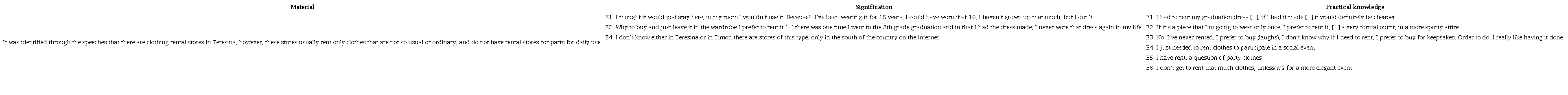 The second model found is through clothing rentals (table 4). The rental stores are used as material and consumption is linked to a search for the reduction of consumerism and the accumulation of unnecessary items for the interviewees. Specifically, rentals focus on more elaborate pieces of clothing that they would only wear once. Some pointed out that they could have the parts made, but in order not to accumulate, they opt for rent. Štefko and Steffek (2018) verify a decrease in consumption in slow fashion consumers, resulting from a prior purchase planning. In the second model, there are elements of reflection by the interviewees about a consumption concerned with the accumulation of pieces that will not be used as often. E4 declared the absence of rental stores with versatile pieces, for everyday use in their city. According to the interviewee, these business models can be found in cities in the south of the country, showing interest in consuming such products.