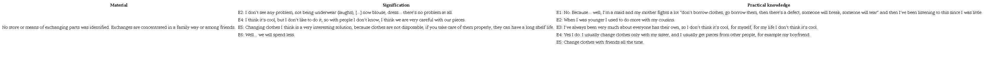 The third model found within the 1st pillar was the exchange and loan of clothes (Table 5). A physical structure (store) was not identified for carrying out the practice and the material consists of exchanges through social ties (family and friends), while practical knowledge is based on trust between the parties, with regard to the care of the pieces, and means a solution to consumerism and waste. Although the three constituent elements of the ‘practice’ were identified, a fear for its realization is perceived through the speeches. For E1 and E3, their family principles consider it inappropriate to promote this practice, even among relatives. The others saw no problem in performing it, as long as between family members and friends who are careful with the pieces. If there was a place responsible for promoting exchanges in a safe way, this could be a way to facilitate the implementation of the model, which can be considered in its current state as a proto-practice.