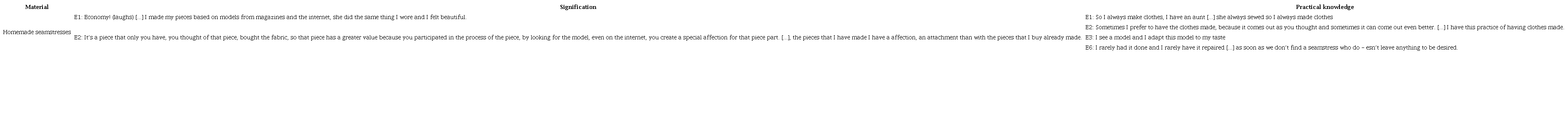 Transparent products are those that allow an interaction between those who buy and those who produce, since their origin is clear and open (Clark, 2008) so the customer acts as a co-author, knowing the history of the piece within the productive chain. Through this research, it was found that the interviewees look for low-cost clothes (material), they say they are unaware of the origin of the items purchased at large retailers (meaning), associated with the convenience of obtaining the pieces (practical knowledge). According to Clark (2008) they are transparent production systems: small industries, sewing and handicrafts. And, although fast fashion prevails, it was verified the adoption of two models by the surveyed ones, sewing (table 6) and handicraft (table 7).