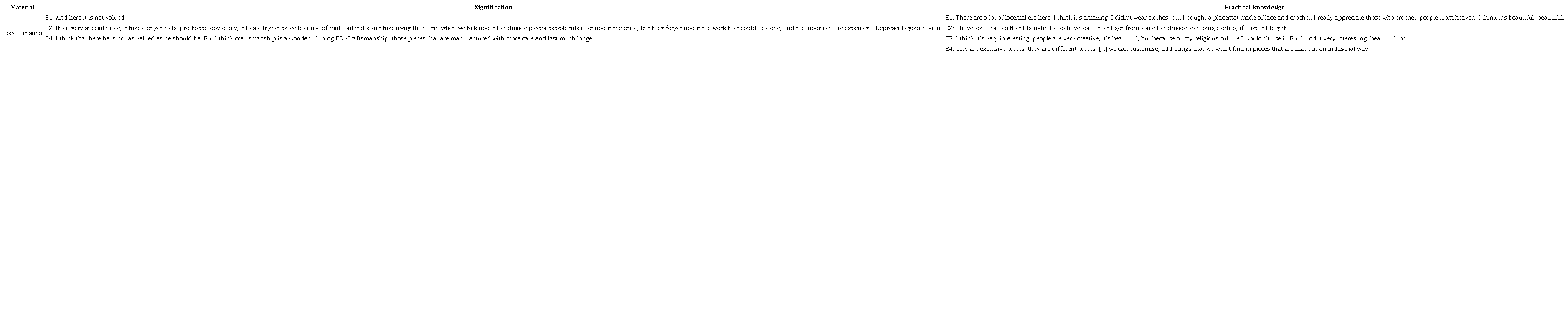 The previous results are closely associated with the second practice identified within the 2nd pillar, the consumption of fashion made using manual skills. The material found was handicrafts and it contains crochet, lace and stamping, products presented as consumed by the interviewees. For them, buying handmade clothes means valuing regionality, recognizing the workmanship and creativity used in the piece. They claim to know that they are unique and exclusive pieces and the practical knowledge for consumption lies in recognizing the value behind the items and, therefore, they know that they need to pay more for such products. For E1 and E4, the practice of consuming handcrafted items is still undervalued and, according to E2, people check the price and forget about the work that was used, without industrial machinery, without scale production. Even knowing that these clothes last longer, as they are made with more care, E6 states that she would buy more if the price were more affordable (Table 7).