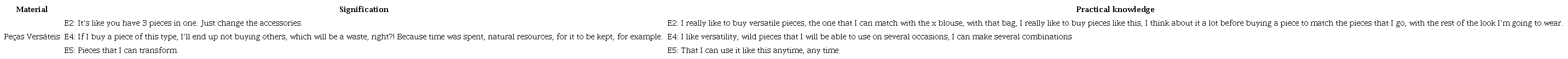 The ‘versatile’ clothing items were identified as material for this practice. Pieces that can be used in different situations, when combined with others, different shoes and accessories. Clothing consumption is represented by the meaning of transforming the pieces and, for E2, “it’s like having three pieces in one”. The practical knowledge is given in the purchase planning, aligned with the knowledge of parts that they already have and that can be combined.