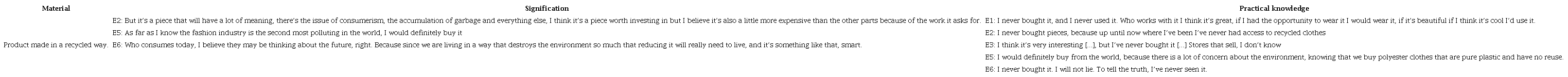 The slow fashion within its pillars brings terms such as “ecological”, “transparent” and “sustainable”. The interviewees were asked about the consumption of products made from recycled material, but no existing material was identified. According to the interviewees, none of them know of stores in their city that work with this type of product. Despite the lack of material and practical knowledge, they showed a curious interest in such products and stated that buying these products would have a lot of meaning. E2 stated that it is clothing that “is worth investing in” and E4, E5 and E6 stated that it means worrying about the future, with the issue of the accumulation of garbage and the pollution generated by the fashion industry. These codes can be interpreted as meaning within a practice, that is, despite their intangibility, meanings constitute an action, event or even an identity (Schatzki, Cetina & Savigny, 2005).