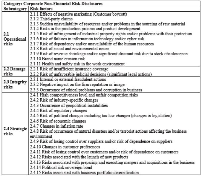 Findings -: There is scientific evidence that the companies with reputations demonstrate non-financial risk disclosure superior to the others. This behavior is confirmed in the subcategories of integrity and strategic risks. Moreover, risk factors in the subcategory of integrity risks were crucial to non-financial risk disclosure.
