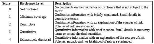 Kim and Yasuda (2018) point out that discretionary disclosure of corporate risk information is a challenge for investigation because it is the evidence of textual nature and unfavorable aspects. Solomon et al. (2000) point out that risk disclosure includes all types of risks that encompass a business, so the information should influence the decision-making of current or potential investors.