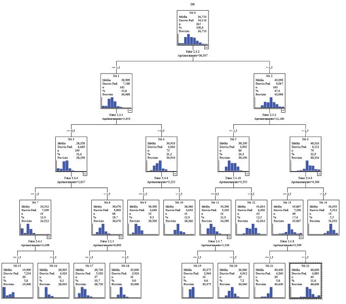 Since the CRT method is developed to maximize homogeneity within nodes, the extent to which a node does not represent a homogeneous set of cases is an indicator of impurity (Pedro, Ferreira, & Mendes, 2010). Thus, the impurity measure used was the LSD (least-squared deviation). In the construction of the tree, the LSD only creates partitions in which the difference between the variance of the ascending node and the sum of the variances of the two descending nodes (weighted by the proportion of cases in each node) is more significant than a defined value, and the value 0.0001 was chosen.