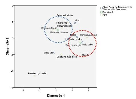 From the Multiple Correspondence Analysis (MCA), through perceptual maps, associations were identified between the level of risk disclosure (general and by subcategories), corporate reputation and the sector in which companies operate. From the proximities evidenced, it was identified an association between: a) Low and Very Low non-financial risk disclosure and companies with no reputation in the Public Utilities and Cyclical Consumption sectors; b) disclosure of integrity and strategic risks, both with a Very High level of disclosure, and companies with a reputation in the Industrial Goods, Non-Cyclical Consumption and Financial sectors; c) companies with a reputation, operating in the Industrial Goods, Non-Cyclical Consumption and Financial sectors, and a Very Low level of damage risk disclosure.