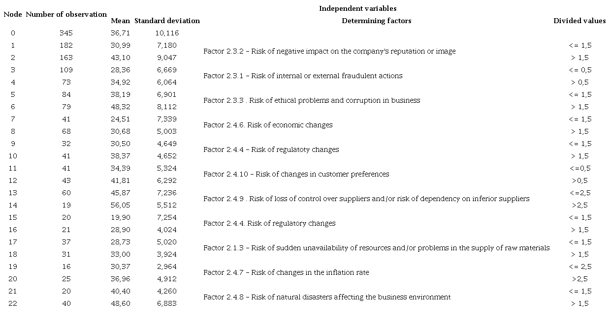 It can be seen from Figure 3 that the companies with the highest DR (disclosure of non-financial risks) are found in node 22 with a mean of 48.600 and standard deviation of 6.883, being those that presented: Factor 2.4.8 - Risk of occurrence of natural disasters affecting the business environment above 1.5; Factor 2. 4.9 - Risk of loss of control over suppliers and, or risk of dependence on suppliers below 2.5; Factor 2.3.3 - Risk of ethical problems and corruption in business above 1.5; and Factor 2.3.2 - Risk of negative impact on the company’s reputation or image above 1.5.