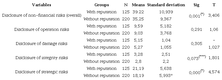 To achieve the third specific objective of comparatively examining the disclosure of non-financial risks between companies classified with and without corporate reputation, the T-test was performed, whose results are shown in Table 2.