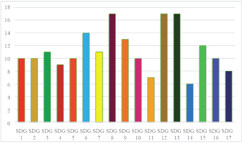 Then, to determine the weighted result, the number of SDGs in each category was multiplied by their respective weights, obtained by the previous calculation.