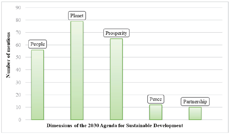 Then, a comparison was made between the dimensions of sustainable development present in the 2030 Agenda, based on the number of mentions of the SDGs present in each category. Thus, Figure 2 exposed the tabulation of mentions, allowing a visual conference of the data achieved.