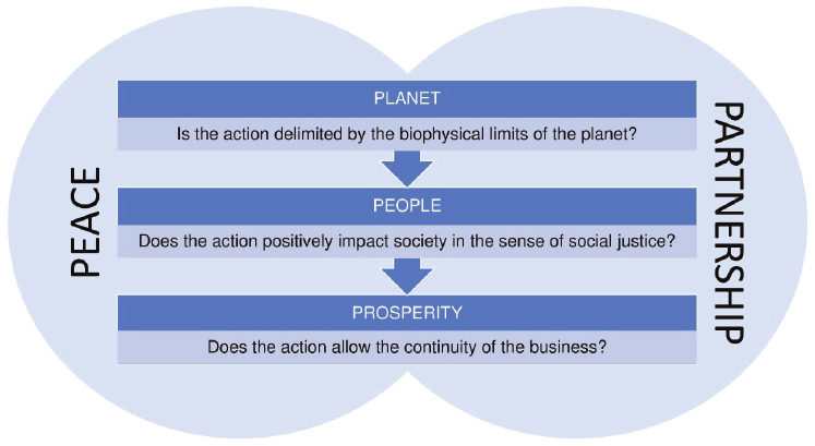 This stated, given the above in the theoretical framework and based on the various models that seek to establish a framework for sustainability and sustainable development, suggest some questions, in the light of ecological-economic premises, which can bring social and environmentally responsible actions closer to the dimensions proposed in the 2030 Agenda, extrapolating the simple mention of the SDGs in their sustainability reports. Attitudes must respect the limits of the Planet, positively impact people’s lives, ensure the prosperity of the organization, be involved by peace and made possible by partnerships, as exemplified in Figure 3.
