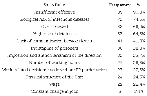 In addition to these factors, another interesting aspect is the relationship with prisoners, which also does not appear among the most representative factors, which is in line with the results obtained by Tschiedel & Monteiro, (2013). These authors justify this fact because of the defenses used by workers to reduce or deny the risk to which they are subject. Thus, this may be the explanation or the fact there really are other issues that currently affect the participants of this research in greater proportion.