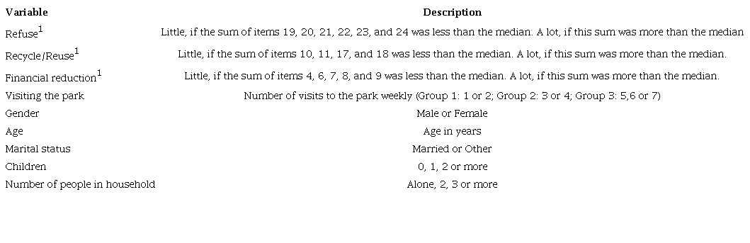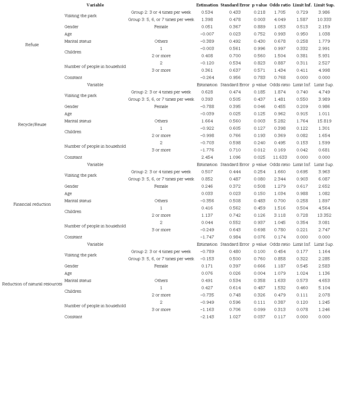 Regarding the refuse dimension, the model shows that none of the characteristics related to gender, age, marital status, number of children, or number of people in household were statistically relevant (5% significance). As for the frequency of visits to the park, group 3 (5, 6, or 7 visits per week) is different when compared to group 1 (1 or 2 visits per week); that is, individuals who visit the park more often are four times more likely to present behaviors related to refuse. These individuals are more likely to make complaints to environmental control agencies or a nonprofit and stop buying products from companies that have already done something harmful to society or the environment.