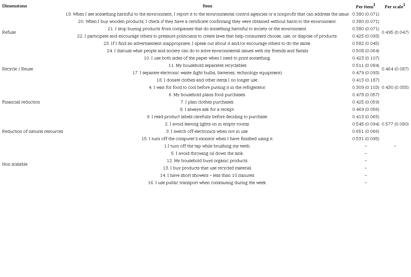 Thus, as a result, four dimensions were formed and named: Refuse, Recycle/Reuse, Financial Reduction, and Reduction of Natural Resources. The dimensions were named based on the theoretical foundation related to the Rs approach rationale and considered the interpretation of the respective item clusters. Table 2 also shows the items that were not scalable, that is, items that could not be associated with the others.