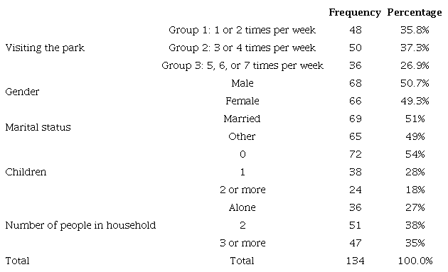 The exploratory analysis of the 134 interviews characterizes the respondents’ profile (Table 3). When analyzing the three groups defined according to the number of visits to the park per week, there are slightly fewer individuals who frequent the park a lot (27%) compared to the two groups that do not go as much. The respondents’ average age was 41 years old, with a deviation of 11.5. In addition, a close distribution was observed between genders and marital status (married or other). Almost half declare that they have no children (54%), and a quarter live alone (27%).