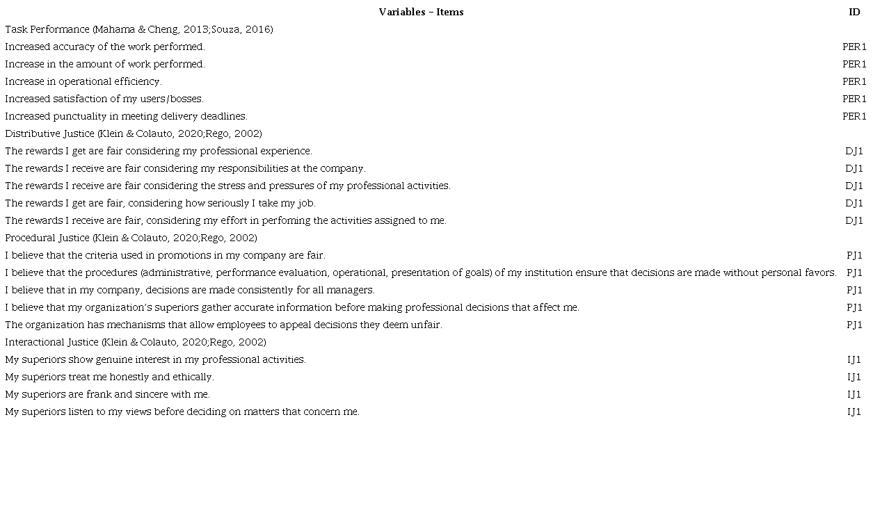 The collection instrument (Table 1) was made available on a virtual platform, with a link sent by email and answered between February 8 and April 15, 2021. The performance and justice variables come from items validated in the international literature, being the object of back-translation procedures to the local language (Brislin, 1970) and pre-test for external validation. The statements were arranged on a five-point Likert scale (with 1 to ‘Totally Disagree’ until 5 to ‘Totally Agree’). The instrument also supported control variables, such as gender, position, age, and time in the organization.