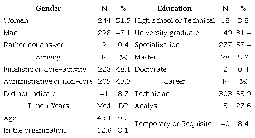 The sample consists of 474 public servants of the Federal Public Ministry, from a group of 4,000 employees selected at random. To validate the sample size, the total effect of the three predictor variables (distributive justice, procedural justice, and interactional justice) on the dependent variable (performance) was considered, with the sufficient sample size being previously calculated, using the G*Power software, with a median effect of 0.15 (F2) and a test power of 95 percent, corresponding to a significance level of 5 percent (F test, LMR, SD 0, a priori), which required a minimum sample of more than 119 valid responses (Cohen, 1988; Faul et al., 2009; Hair et al., 2016).