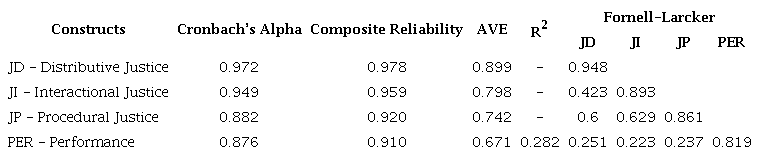 The discriminant validity showed satisfactory indicators in the Fornell-Larcker matrix, as Table 3, with the highest load directed to the corresponding variables, however, the evaluation of cross loads revealed high contributing indicator for more than one variable and others with insufficient loads. Thus, of the 21 indicators of the research instrument (Table 1), only one indicator of the procedural justice variable (PJ5) is excluded.