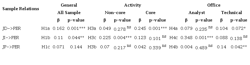 Between interactional fairness and inverted task performance in position typologies, significantly only for analysts (H4b: analyst β= 0.348; p.<0.001 | β=0.088; p.<0.138). These findings reflect the internal management connections of the organization (Fernandes et al., 2007), reinforcing the evidence of the importance of the non-core activity (H3b), even though management posts are allocated (distributively) to members of any type of position, in principle, based on efficiency and meritocracy.