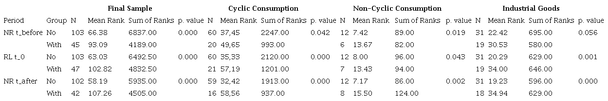 By segmenting the comparison of the groups inside the own sector, you can verify that only the non-cyclic consumption sector at t_before did not show significant difference at 0.05 level. The rest of the periods and other sectors showed significant differences at the level of 0.05. The cyclic consumption sector showed the values: t_ before (U = 322.0; p = 0.005); t0 (U = 329.0; p = 0.001); and t_after (U = 154.0; p = 0.000). The non-cyclical consumption sector showed the values: t_before (U = 21.0; p = 0.160); t0 (U = 9.0; p = 0.011); and t_after (U = 16.0; p = 0.014). The industrial goods sector showed the values: t_before (U = 135.0; p = 0.001); t0 (U = 95.0; p = 0.000); and t_after (U = 123.0; p = 0.001).