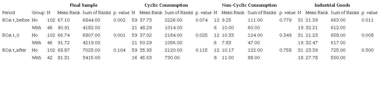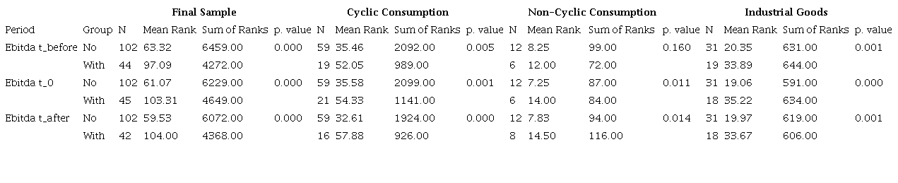 By segmenting the comparison of the groups within the sector itself, you can see that the cyclic consumption sector did not show a significant difference at the level of 0.05 for any of the three periods, while in the industrial goods sector it was only at t_before. The rest of the periods and sectors showed significant differences at the level of 0.05. The cyclic consumption showed the values: t_before (U = 531.0; p = 0.443); t0 (U = 600.0; p = 0.746); and t_after (U = 435.0; p = 0.483). The non-cyclic consumption sector showed the values: t_before (U = 13.0; p = 0.031); t0 (U = 8.0; p = 0.009); and t_after (U = 20.0; p = 0.031). The industrial goods sector showed the values: t_before (U = 244.0; p = 0.313); t0 (U = 196.0; p = 0.049); and t_after (U = 130.0; p = 0.002).