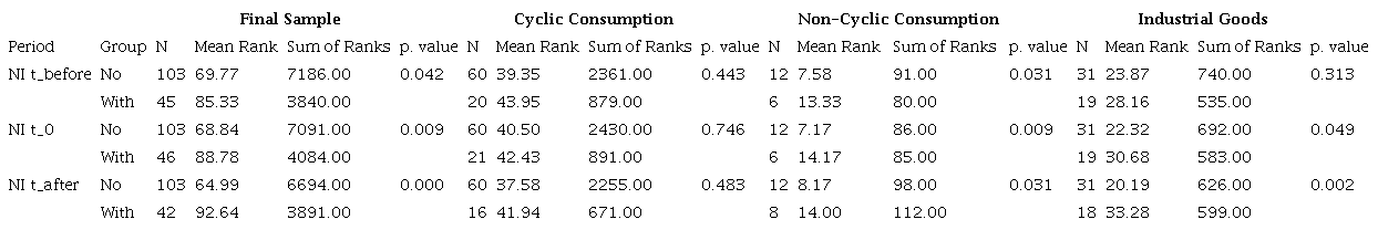 By segmenting the comparison of the groups within the sector itself (cyclic consumption, non-cyclic consumption, and industrial goods) you can see that only the industrial goods sector at t_before showed no significant difference at the level of 0.05. The rest of the periods and other sectors showed significant differences at the level of 0.05. The Cyclic Consumption sector showed the values: t_before (U = 417.0; p = 0.042); t0 (U = 290.0; p = 0.000); and t_after (U = 143.0; p = 0.000). The Non-cyclic consumption sector showed the values: t_before (U = 11.0; p = 0.019); t0 (U = 18.0; p = 0.043); and t_after (U = 8.0; p = 0.002). The industrial goods sector showed the values: t_before (U = 199.0; p = 0.056); t0 (U = 133.0; p = 0.001); and t_after (U = 100.0; p = 0.000).
