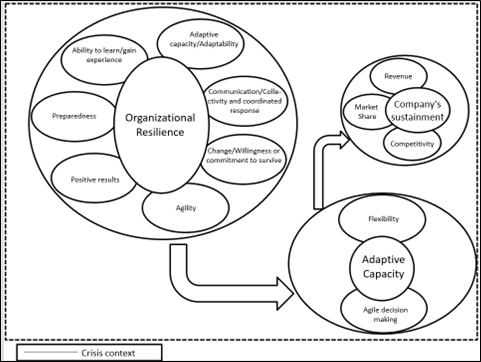 Figure 1 shows the relationship between the constructs analyzed in this study, with the aim of showing how the analyzed elements of organizational resilience (adaptive capacity/adaptability, learning ability/gaining experience, being prepared, positive results, agility, leadership, change/willingness or commitment to survive, communication/ collectiveness and coordinated response) bring out the adaptive capacity (flexibility, agile decision-making), enabling adaptation and, thus, providing support for the organization (revenue and market share, and competitiveness) in the face of to a period of crisis.