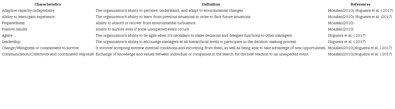 The adaptive capacity is related to resilience in the attempt to recover from a period of crisis, aiming for companies to overcome this period, providing strength for future moments of turbulence (Sutcliffe & Vogus, 2003). Furthermore, Carmeli and Markman ( 2011) point out that companies that make potential use of resilience to overcome such periods tend to exhibit organizational longevity.