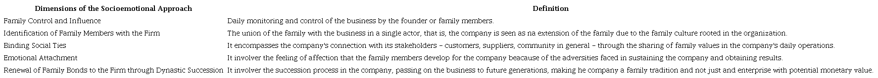Given the notorious differentiation between family businesses and traditional ones, the dimensions of socioemotional wealth are expected to substantiate the analyses, since socioemotional aspects are present within the structure of family businesses, influencing their decision making ( Berrone et al., 2012).