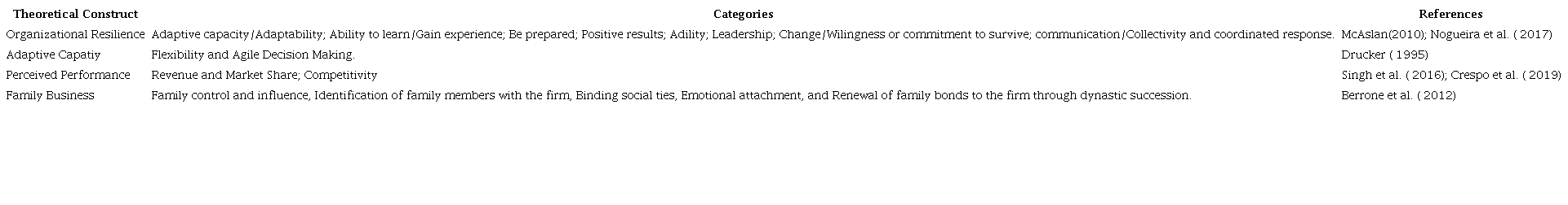 Based on the categories listed above, the data collected was coded within each category in order to discern the interviewees’ statements, as well as the documentary data from the literature. Through this, it was possible to distinguish which codings involved each research construct and, in this way, make it easier to understand the dynamics of the relationship between organizational resilience and the adaptive capacity of a family business from Rio Grande do Sul, aiming to sustain its performance amidst the pandemic caused by the coronavirus.