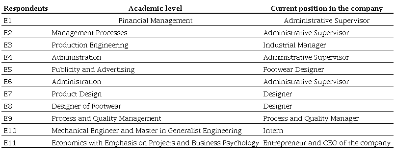 Among the eleven respondents, five women and six men participated, aged between 25 and 54 years. Respondents will be identified by the acronyms E1, E2, E3, E4, E5, E6, E7, E8, E9, E10 and E11. Respondents E2, E5 and E6 belong to Branch 1, where women’s sandals are manufactured; respondents E3, E4 and E8 belong to Branch 3, where men’s and children’s shoes are manufactured, while respondents E1 and E7 belong to Branch 16, where injected women’s shoes are manufactured, all the chosen interviewees are related to the topic addressed, based on previous experience and professional trajectory.