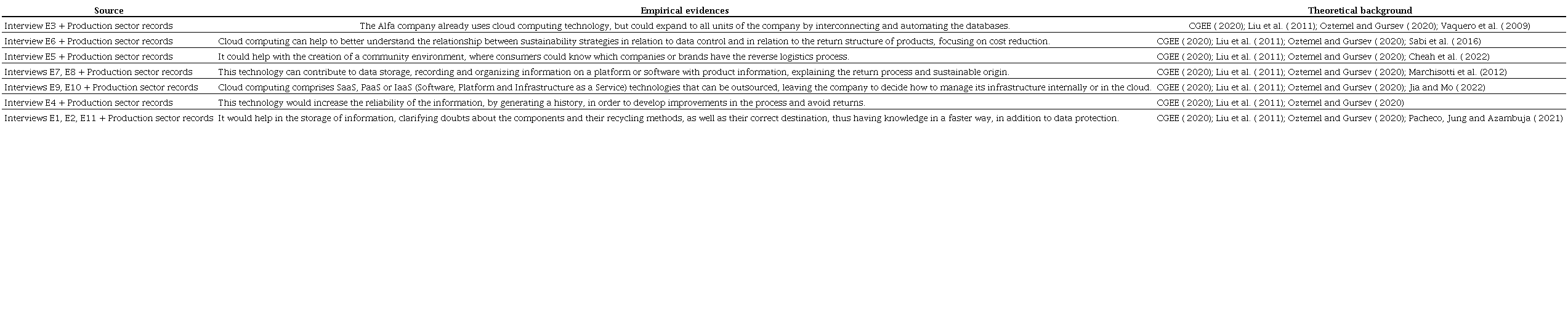 Due to this convergence, it was also decided to evaluate how cloud computing could contribute to the reverse logistics process. E3 has already started by answering that the Alfa company currently already has a database of return flows, work rates, among other information, in cloud computing. It ensures that the cloud database could make this information available to all company units, to be worked on the issue of the product that returns to the company at the main points of return, to reduce the product volumereturned to the company. The product that the customer received with a quality problem is registered in a database for analysis and adoption of actions to manage these cases, enabling their mitigation and reverse logistics. The importance of cloud computing for systematic organizational records, related to the company’s operation, was also mentioned by Perera et al. ( 2015).