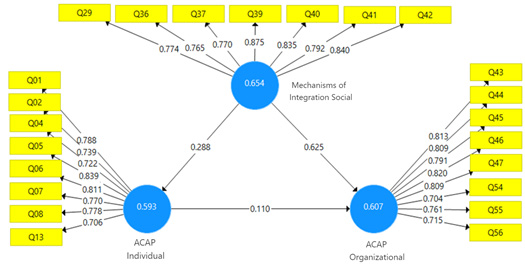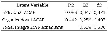 When considering the Effect Size (f2) or Cohen’s Indicator, obtained by the inclusion and exclusion of constructs from the model (one by one), it can be observed how much each construct was helpful for the model adjustment. Values of 0.02, 0.15, and 0.35 are considered as a small, medium, and significant effects, according to Cohen [-26]. Thus, the effect of individual ACAP on Organizational ACAP is positive but with a moderate effect. On the other hand, the Social Integration Mechanisms also had a positive effect, solid. Next, the path coefficients and the student t-test are evaluated. Table 5 shows the data obtained for the SEM.