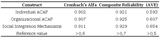 Observing Table 1, it can be seen that all the constructs used had results close to 1.0. The results demonstrate the reliability of the measurement instrument, as it is noted that Cronbach’s Alpha and Composite Reliability meet the minimum acceptance criteria (Cronbach’s Alpha> 0.70 and Composite Reliability >0.70) (Hair, Sarstedt, Hopkins, & Kuppelwieser, 2014). The AVE values, all above 0.5 for the latent variables, indicate sufficient convergent validity for the model (Henseler, Ringle, & Sinkovics, 2009).