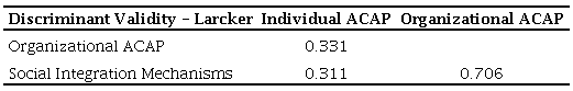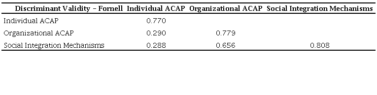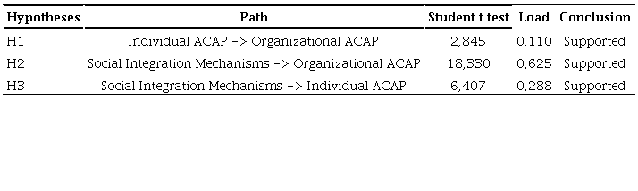 Before discussing hypotheses 2 and 3, it is imperative to point out that organizational and individual capacity depends very strongly on interactions between individuals and groups within the organization. Consequently, we affirm that to develop the absorption of organizational and individual knowledge, according to the findings of this research, organizational mechanisms that create a positive environment for individuals are required. These organizational mechanisms can be called social integration mechanisms. They promote knowledge absorption by bringing people together and promoting the connection and shared meanings among the employees of an organization throughout the entire knowledge absorption process.