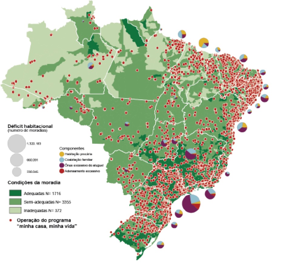 Ao mapear as ações do programa verifica-se que as novas casas foram realmente implantadas em regiões de déficit habitacional bastante expressivo, sobretudo nos Estados de São Paulo, Rio de Janeiro, Minas Geras, Bahia, Pernambuco, Maranhão e Pará. Porém, há diferenciação nos elementos que compõem este déficit. Com relação às habitações precárias, Maranhão é o Estado com maior percentual, seguido de perto por Pará, Piauí, Ceará e Bahia. Já o componente de coabitação familiar representa mais de um terço das moradias no Pará, Ceará, Rio Grande do Norte, Paraíba, Sergipe, Alagoas, Bahia, Minas Gerais, Rio de Janeiro e Rio Grande do Sul. Em outros Estados foi o ônus excessivo que o aluguel representa no orçamento familiar que impulsionou as pessoas a procurarem ser beneficiadas pelas ações do programa.