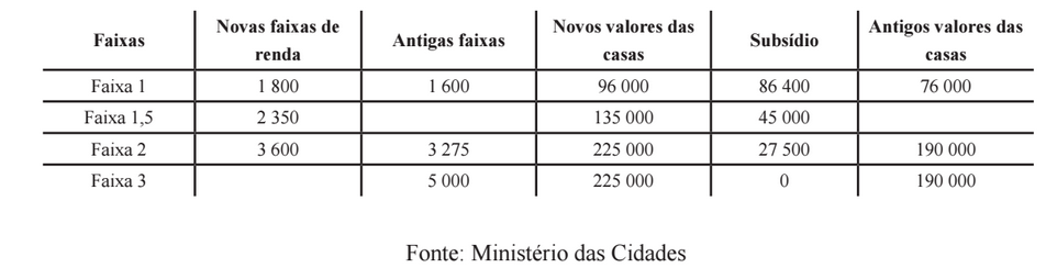 Das duas milhões de casas previstas até 2014, 1,2 milhão eram para famílias que ganhavam até R$ 1 600 por mês. Para famílias com renda de até R$ 3 100, a meta era contratar 600 mil habitações. Já com renda até R$ 5 mil, seriam 200 mil unidades. Além disso, o governo tinha atendido a reivindicação das construtoras e ampliado o valor médio das moradias para a população de mais baixa renda, de R$ 42 mil a R$ 55 mil. Em 2014, ano em que disputou a reeleição, a presidente da República havia prometido que a terceira fase do programa habitacional entregaria 3 milhões de residências.