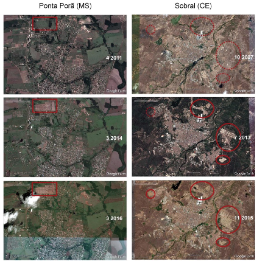 Dans les villes moyennes l’impact du programme est fort parce qu’il a conduit à la construction de quartiers qui deviennent souvent les plus grands de la ville. L’option « images historiques » Google Earth permet de suivre les étapes de leur apparition à la périphérie des villes, comme à Ponta Pora et Sobral, sur la figure 5 et dans les paragraphes suivants.