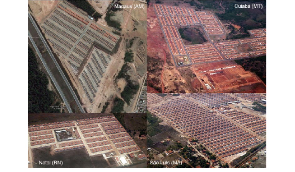 Le programme Minha casa, minha vida (“Ma maison, ma vie”), le plus grand programme de construction de logements des trente dernières années, a profondément changé le paysage de nombreuses villes brésiliennes en y créant d’immense quartiers de maisons identiques, alignées au cordeau et très proches les unes des autres (figure 3). Lancé en 2009, au cours du second mandat de l’ancien président Luíz Inácio Lula da Silva, il est devenu l’un des principaux fleurons des politiques gouvernementales de Dilma Rousseff. Conçu pour stimuler la construction et à lutter contre les effets de la crise économique internationale, le programme est devenu un instrument pour réduire le déficit de logements dans le pays. Si elle est menée à bien, la troisième phase du programme, lancée en mars 2016, portant le total de maisons construites à 5,75 millions de maisons pour 23 millions de bénéficiaires, pourrait lui faire dépasser les résultats de la BNH (Banque nationale du logement), créée sous la dictature militaire (1964-1985).