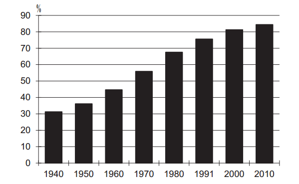 Brazil is fast becoming a predominantly urban country, which is urbanizing at an increasingly greater speed. In a few decades, demographic census data have confirmed the tendency of an increase the urban population, with a rate of 31.34%, that is, 41,236,315 people lived in urban areas in 1940. By 2010, the urbanization rate was 84.36%, totaling 160,925,792 million inhabitants living in cities (IBGE, 1940 to 2010). The data in Figure 1 illustrate this increase in urbanization rates in Brazil from 1940 to 2010.