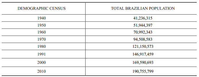 The growth of the Brazilian population, reaching 190,755,799 million inhabitants in 2010, can be associated, among other factors, with the birth rates, the reduction of mortality rates, increased life expectancy, related to advances in health and improvements in the population’s quality of life (IBGE, 2010). The data in Table 1 show the considerable growth of the Brazilian population over the last decades.