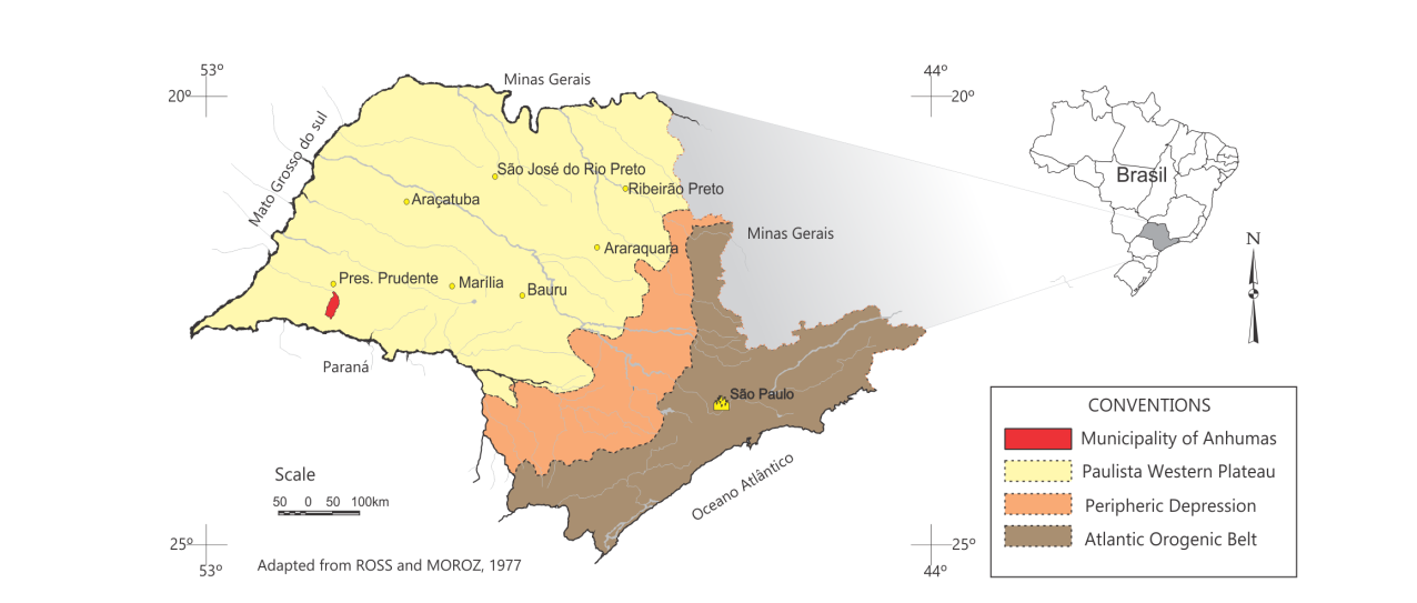 The municipality of Anhumas is located in the western portion of the state of São Paulo, in the Presidente Prudente region, occupying an area of 320 km2, the coordinates of the central point of the city are: 22º 17 ‘45 “S (Latitudinal) and 51º 23’ 08” W (Longitudinal), located in part of the Paulista Western Plateau (Figure 1).