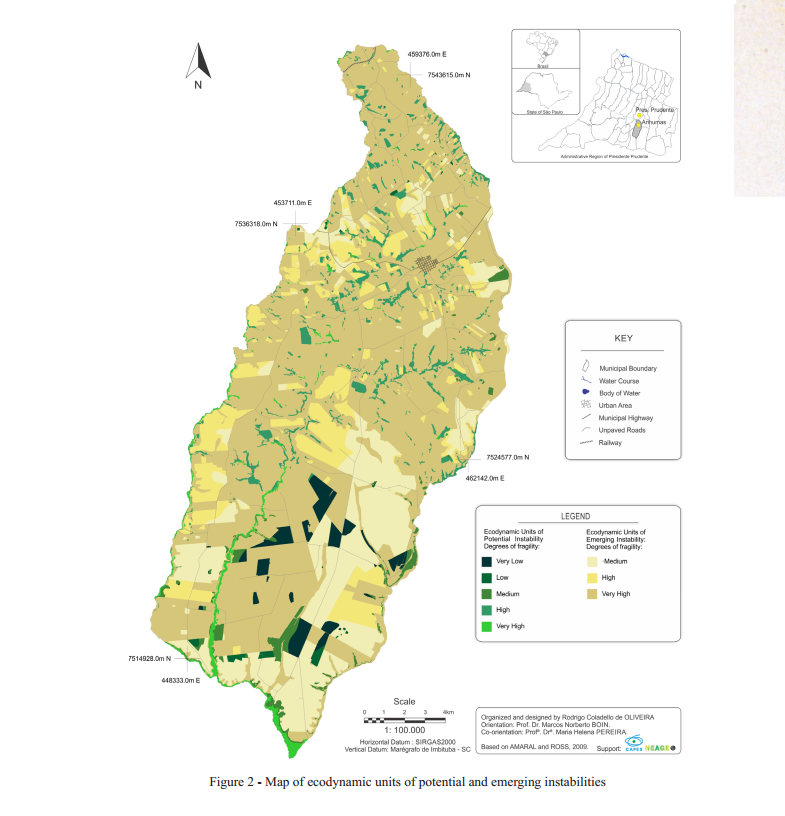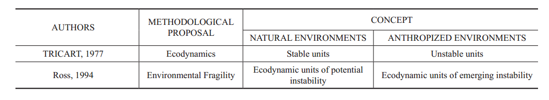 In order to determine environmental fragility, the model proposed by Ross (1994) - based on the ecodynamic and ecosystem concepts previously defined by Tricart (1977) (Table 1) – was adapted to determine potentially unstable ecodynamic units (stable) and emerging instability (unstable), classified by degrees of fragility (Figure 2).