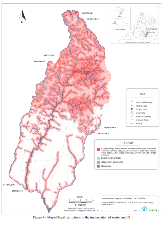 The theoretical framework of the present work is based on landscape theory, using the systemic approach as a paradigm. In order to do so, we sought work on landscape interpretation, ecology, ecosystem, ecodynamics, general systems theory and geoecology, based on the works of Von Bertalanffy (1950), Christofoletti (1972), Tricart (1977), Bertrand & Bertrand (2002), Bertrand (1995; 2004), Guerra & Marçal (2012), Mateo Rodriguez (2000, 2006) and Mateo Rodriguez et al. (2004, 2006). To complement the theoretical structuring of the landscape, our study also relied on other authors who work with planning methodologies such as: Oliveira (1983), Bergamo & Almeida (2006), Nucci (2009), Ross (2012) and Santos (2004). After this, to give context to the research, a review was carried out of Works on the theme of solid waste, landfills and attributes for choosing locations, noteworthy studies were by Zuquette; Pejon & Sineli (1994), Leite (1995), Leite & Zuquette (1996), Tressoldi & Consoni (1998), Nunes (2002),Montaño et al. (2012) and Boscov Gimenez (2012). This methodology consisted of the organization of the inventory and the elaboration of an environmental diagnosis and prognosis. Once this was completed and the legal restrictions to the territory of the municipality had been applied, a map of the legal restrictions was produced, which allowed the comparison with the characteristics of the physical environment and its interrelations with the restrictive components.