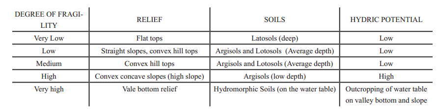 The environmental fragility with respect to the disposal of residues (solid, liquid or even gaseous) is accentuated in the predominant areas of Oxisols due to their high permeability and in the areas of the Argisols and Hydromorphs, due to their proximity to the water. Dense and disordered occupation compromises natural resources, unbalancing the flows of matter, energy and information in the geoenvironmental systems.