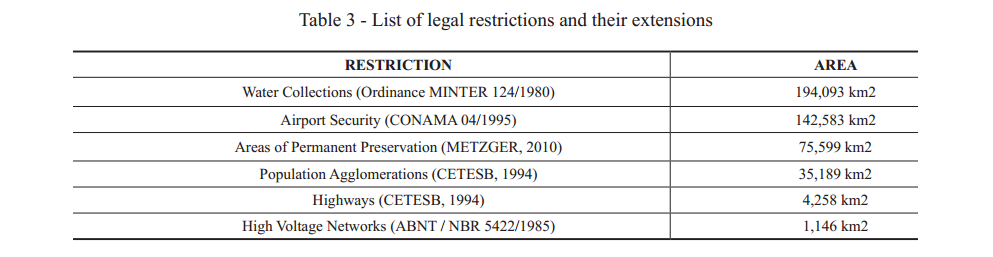 Thus, through the analysis of metric operations extracted from the GIS, the extensions of these legal rules are Table 3, in which the pre-established restrictions considered in this work and their respective areas are presented.